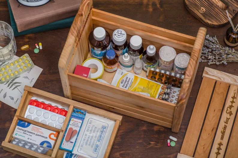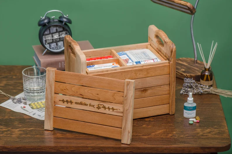 Beyond its functional role, the Medicine-Pharmacy Box doubles as a decorative element. Its wooden construction exudes a classic charm, seamlessly blending with various interior designs. Additionally, there's an option for customization: special engravings. Whether it's a family name, a meaningful quote, or a simple design, these engravings can transform the box into a personalized heirloom, reflecting the unique tastes and preferences of its owner.