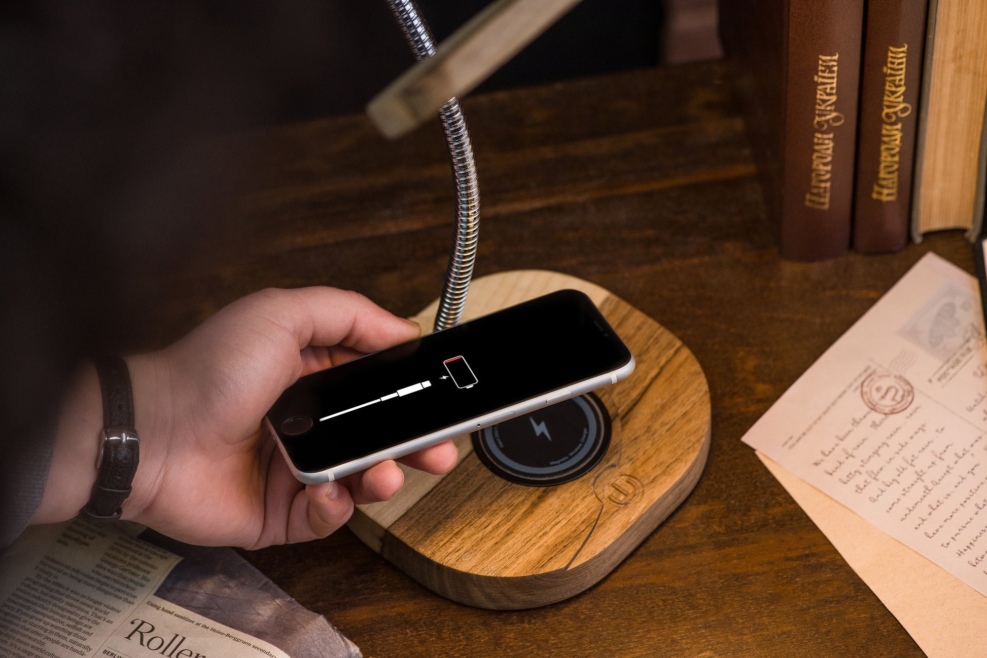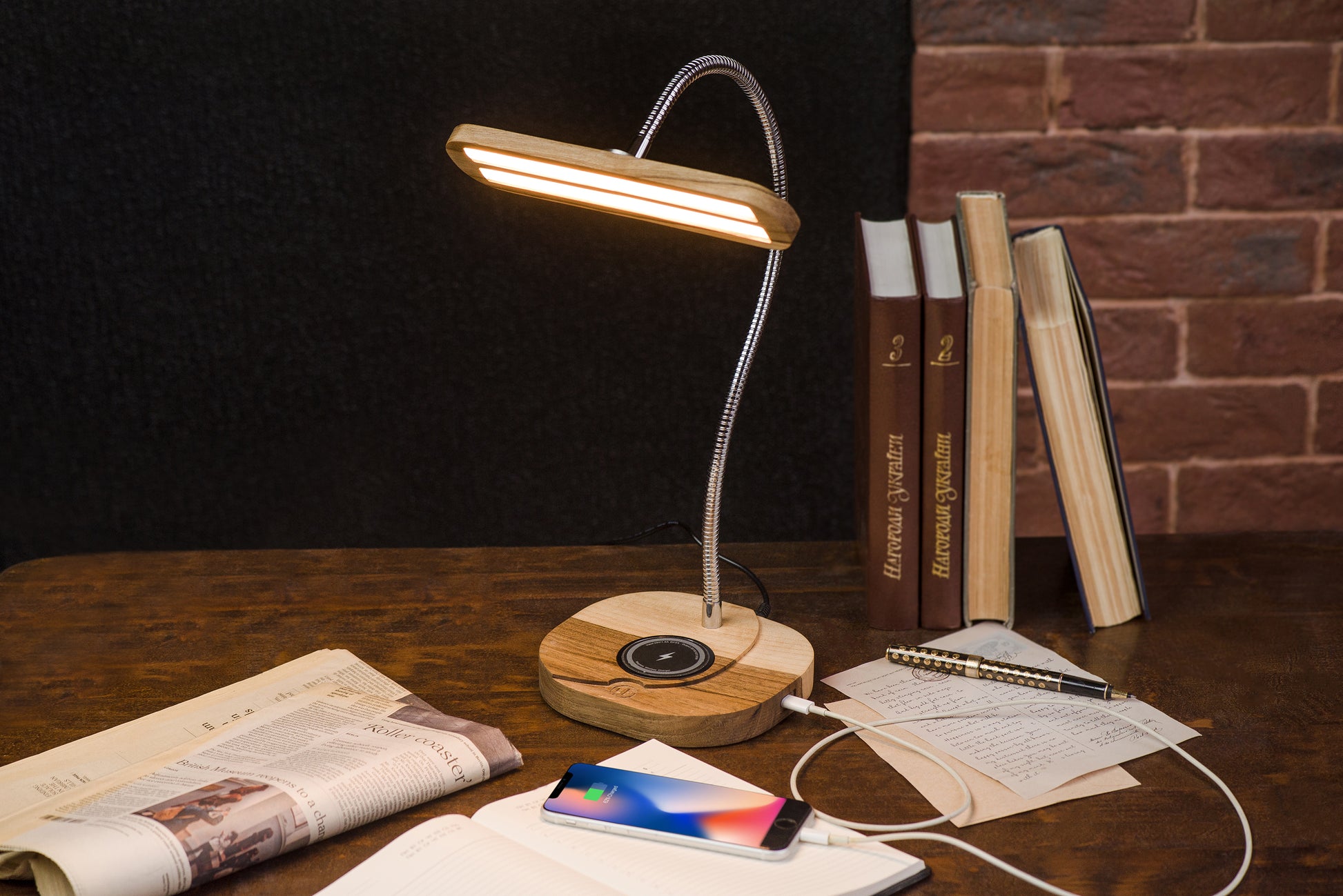 Wooden LED desk lamp with USB charging for phone or other gadgets and easy to use adjustable brightness control.
